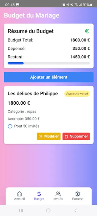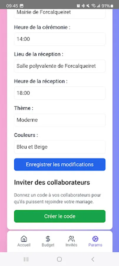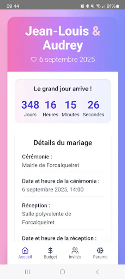 💍 **Event Creation**: Personalize your wedding, enter key information (date, location, theme, etc.), and easily share it with your loved ones.