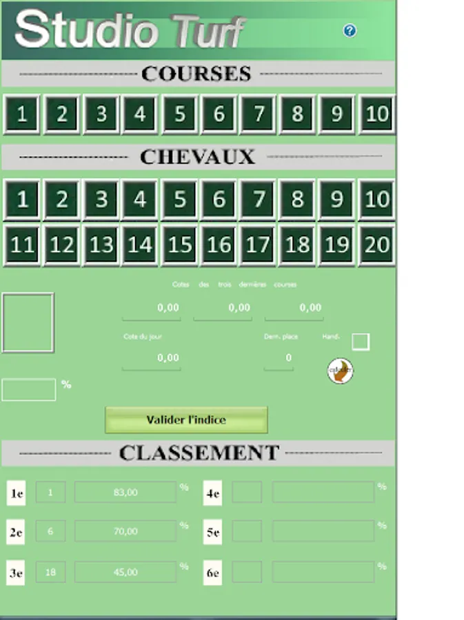 The Studio Turf Zen application allows you to calculate the "confidence index" of horses at the start of a PMU or PMH horse race. You can work out your predictions based on the horses' latest performances and their regularity, on a complete meeting of harnessed or mounted trot, flat gallop or obstacles.