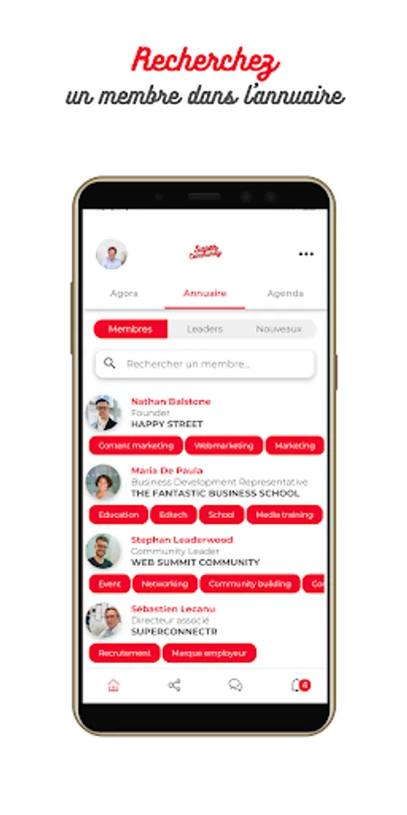Easily search for a super member of the community by last name, first name, company, skill, location... The essentials to facilitate research and identification between members!