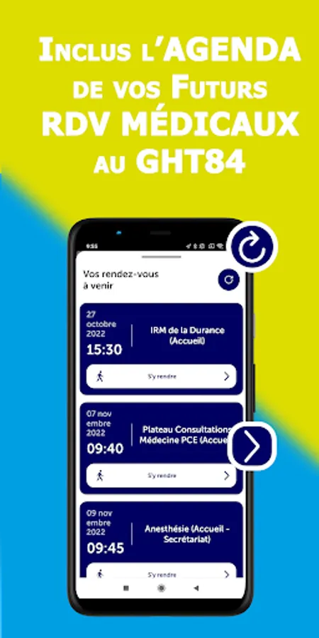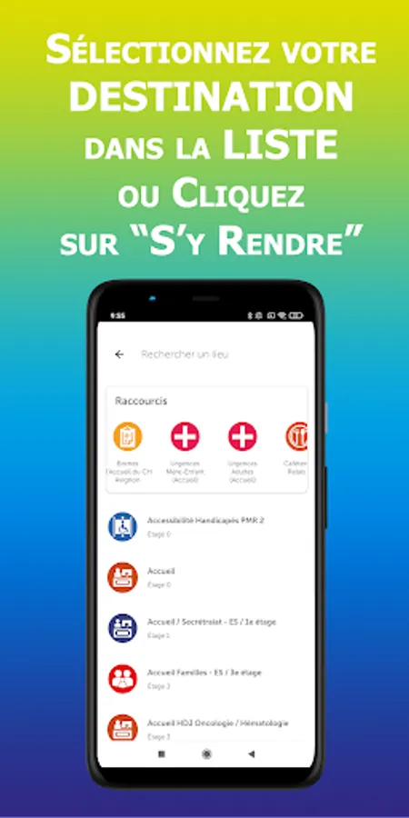 HospiGuide directs you from anywhere to the service of your choice at the CH d'Avignon or the CHI de Cavaillon-Lauris. No need to sort your invitations or add your appointments to your electronic agenda, HospiGuide includes an agenda listing all your future medical appointments. If your appointment is modified (date, time and/or place), your calendar is automatically updated at the next launch. Thus, by logging in, you will always find the updated list of your appointments. And, as on your arrival you will have to register at the entrance office or directly at the secretariat, your itinerary will suggest the appropriate administrative step. And if you are a visitor or a member of staff, so without an appointment, simply search for your place of arrival in the list of destinations without logging in.