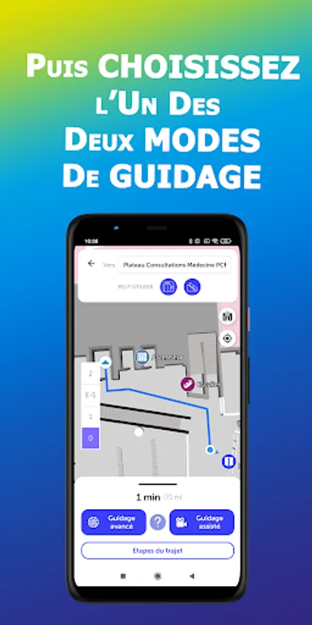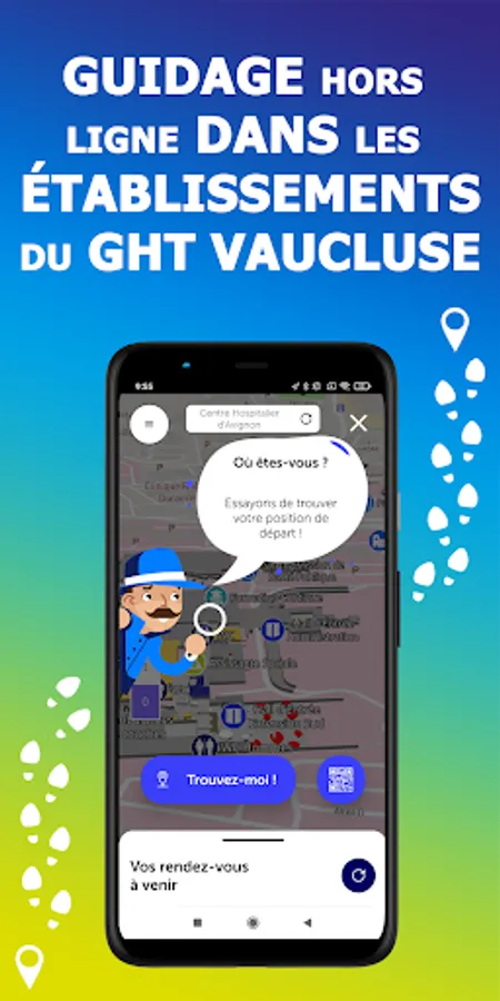 Outside, your guide behaves like any GPS application, inside, it is an IPS (Indoor Positioning System) application. Inside the hospital, in advanced mode, your phone becomes an intelligent compass, while in assisted mode, it's an on-board computer. In both cases, just follow the adventurer's instructions to reach your destination in the CH d'Avignon or the CHI Cavaillon. By accepting all permissions requested by the system, you will allow IPS to guide you more efficiently.