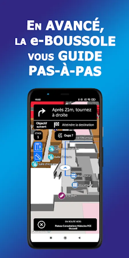 By opting for ADVANCED guidance, the GHT Vaucluse e-compass guides you step by step in the hospital. The guidance system considers your phone's movements to be yours. Just hold it like a compass pointing in the right direction. By agreeing to share your location at all times, your compass signals will be more accurate and your experience will be improved.