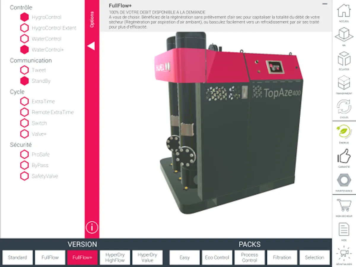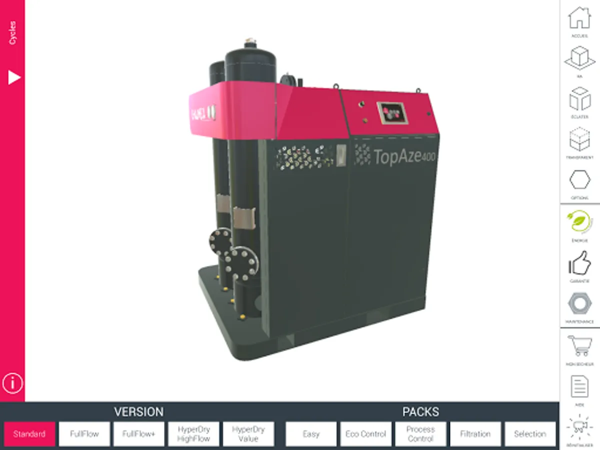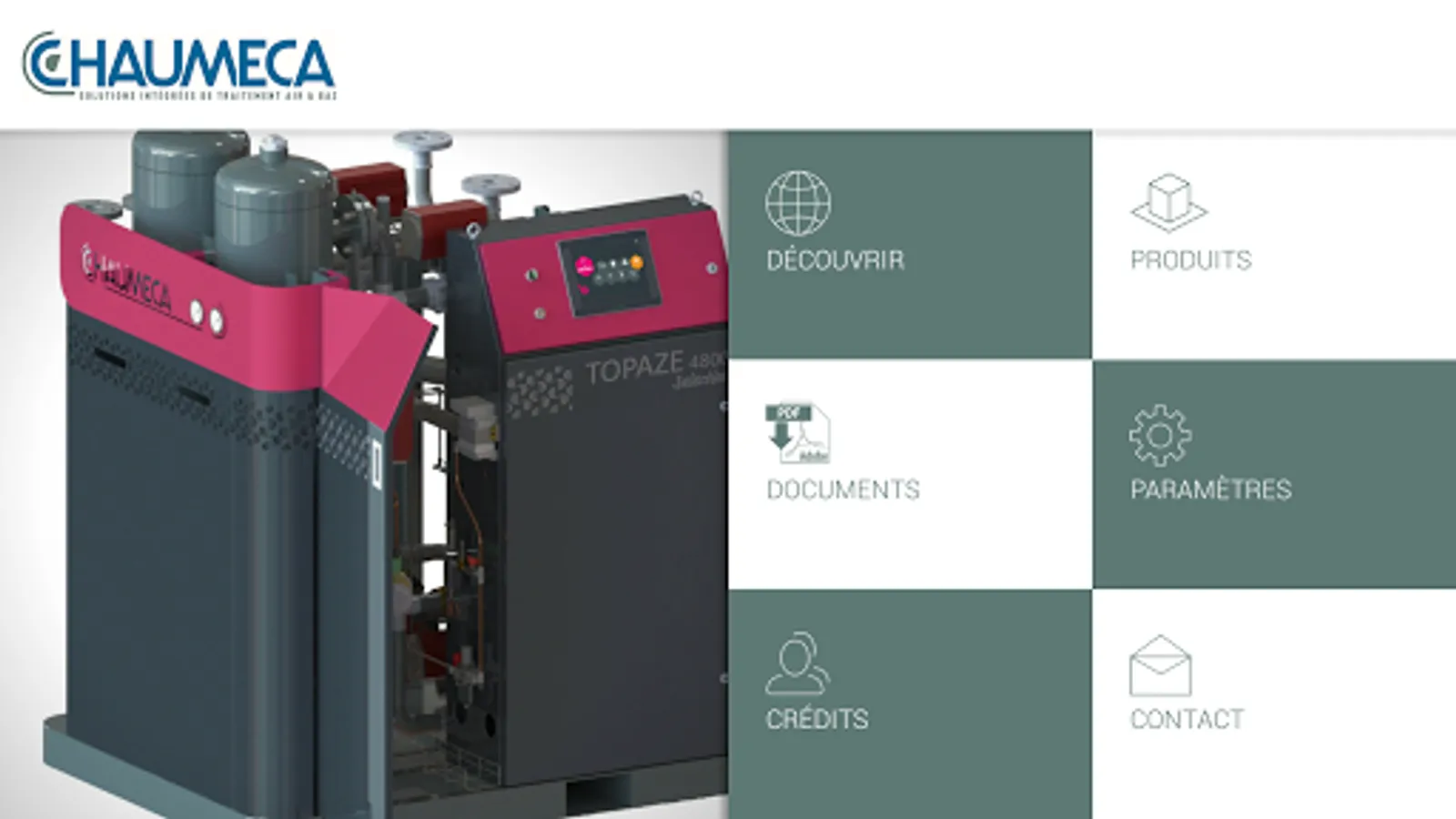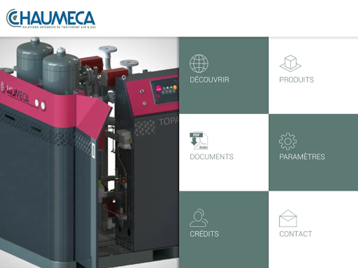 Immerse yourself in 3D and augmented reality to discover our range topaz, Dryer Adsorption. Equip your dryer filters, open the door to see maintenance areas, choose your options. Once your selection is made, register your product plug to complete your request. Our agents are at your disposal if you want a fully personalized offer adapted to your needs. Also Browse the CHAUMECA application to discover other features and our offer. A scalable tool, interactive and complete. www.chaumeca.com