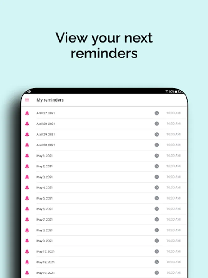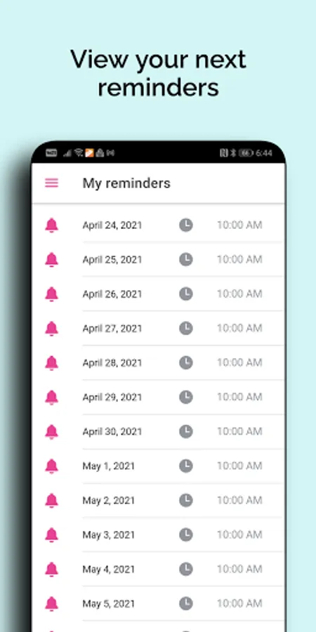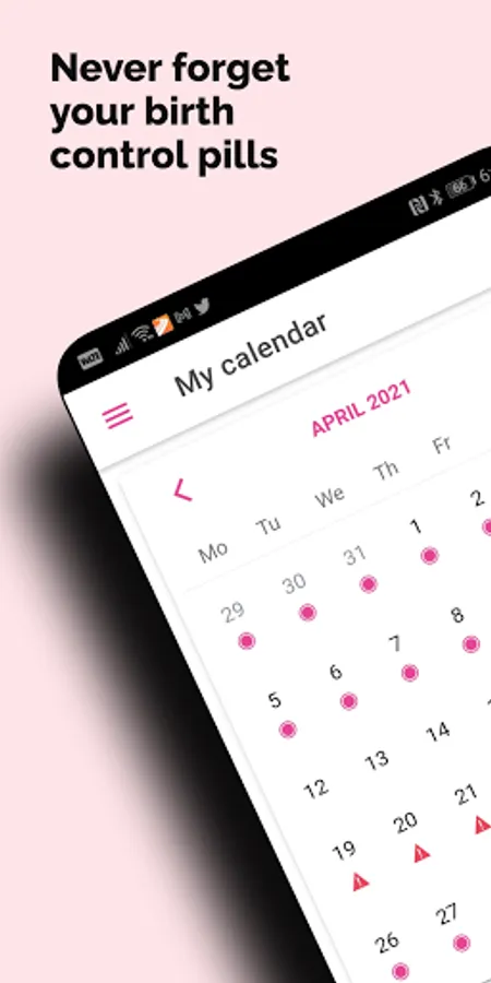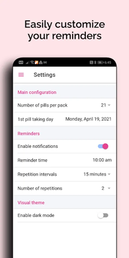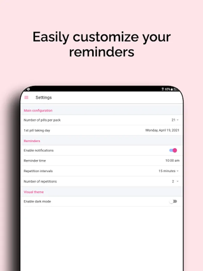 Pill reminder allows you to set the interval and number of repetitions of the reminders, until you have taken your birth control pill.