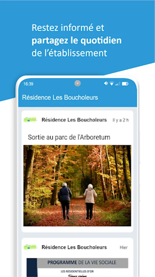 The application is available for individuals whose loved one lives in the Les Boucholeurs residence. Access the activities that the establishment sets up, send text messages and voice notes, share photos, make video calls and recreate the social link around your loved one.