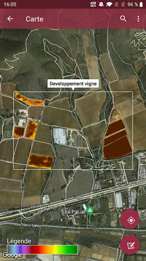 Oenoview Plantier is an application for consulting in the field the data produced by the Oenoview Plantier service developed and distributed by the companies TerraNIS and ICV. Thanks to precise geolocation, the content of the vine development maps (as well as that of the zoned maps) can be viewed and verified in the field. The winegrower can annotate the maps that relate to his vineyard plots and consult the content of these annotations later on his desktop computer. He can also choose to send these annotations by email in Google KML format.