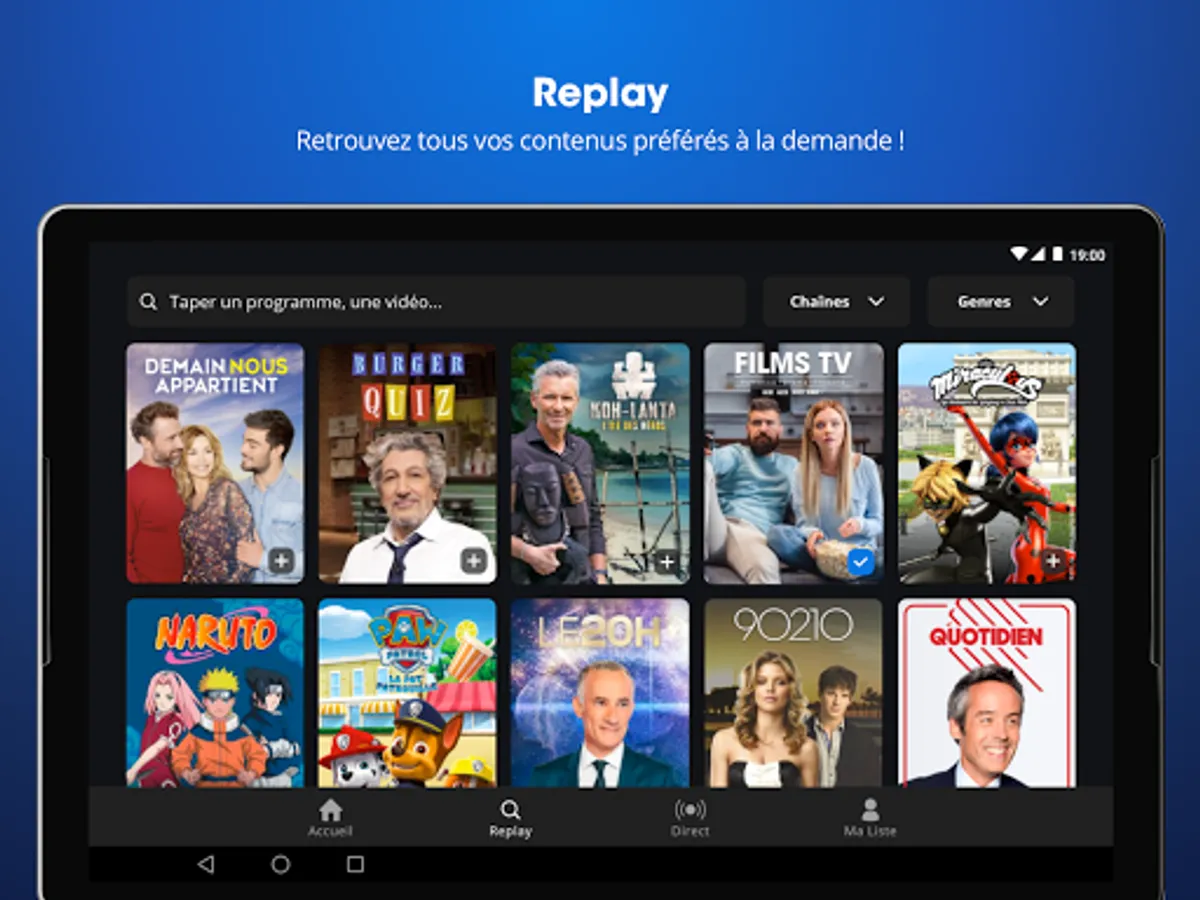 - REPLAY: find all your favorite content on demand! Entertainment, news, US series, French fictions, youth programs, TV films, sports, magazines… browse and choose from a catalog of thousands of videos.
