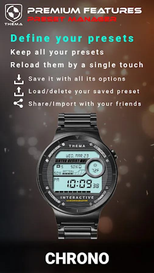 + Save your preset with all its options (colors, backgrounds, data, features. EVERYTHING is saved!)