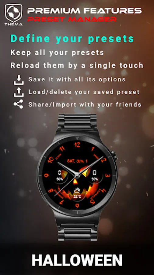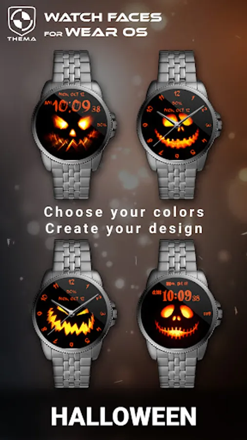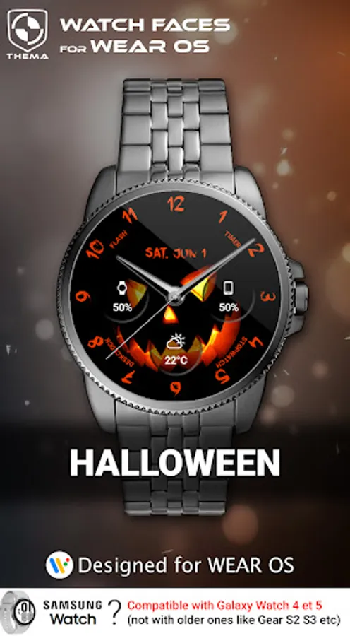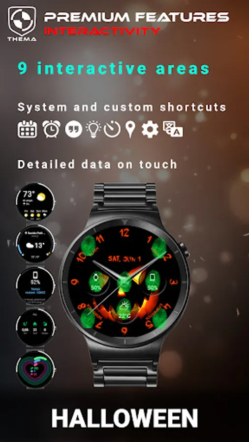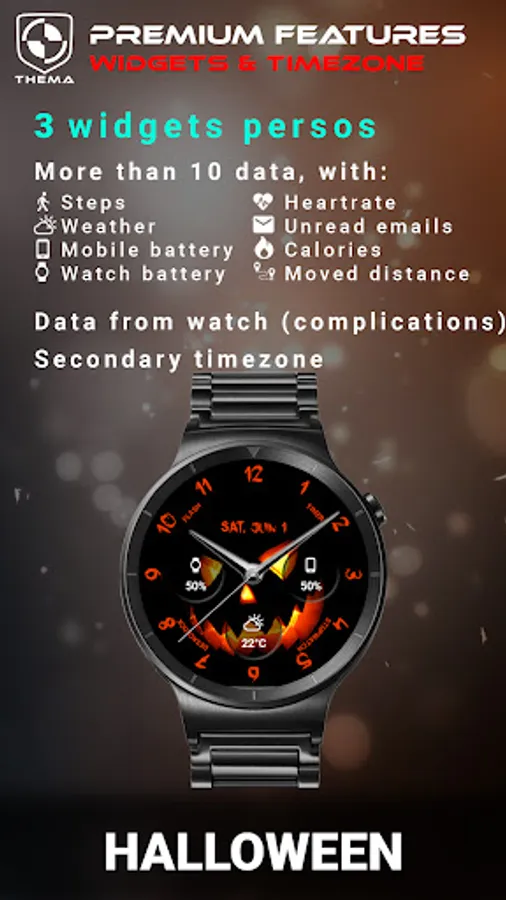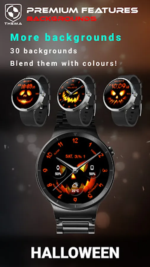 - This watch face allows you to choose your favorite pumpkin design (17 availables).