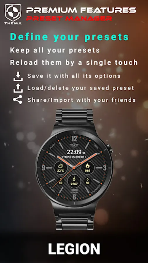 + Save your preset with all its options (colors, backgrounds, data, features. EVERYTHING is saved!)
