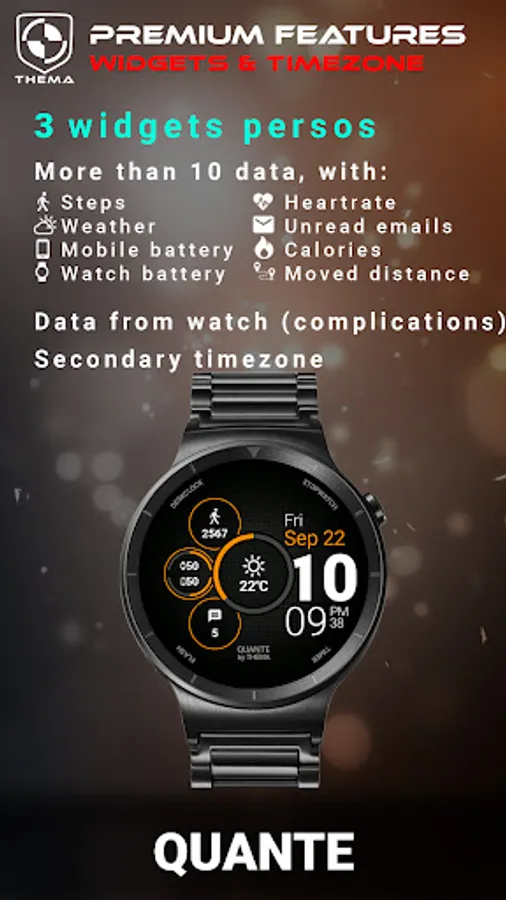 + Choose between up to 8 indicators (Daily step count, Heartbeat frequency, Unread Email from Gmail, etc...)