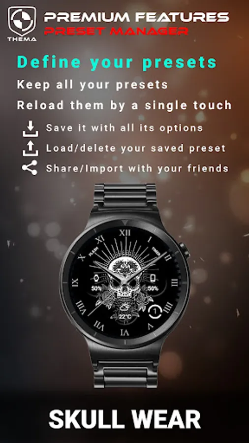 + Save your preset with all its options (colors, backgrounds, data, features. EVERYTHING is saved!)