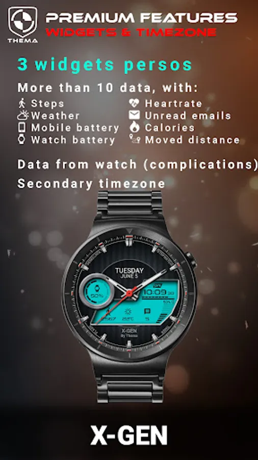 + Choose between up to 8 indicators (Daily step count, Heartbeat frequency, Unread Email from Gmail, etc...)