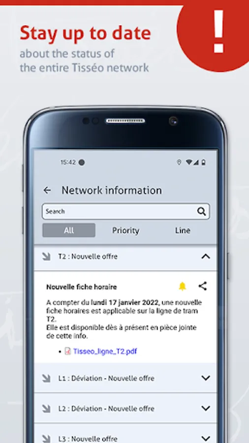 - Network information and alerts: new lines, new routes, traffic problems or roadworks; keep informed about the latest news concerning the Tisséo network at all times. You can also receive notifications if there are any major disruptions!