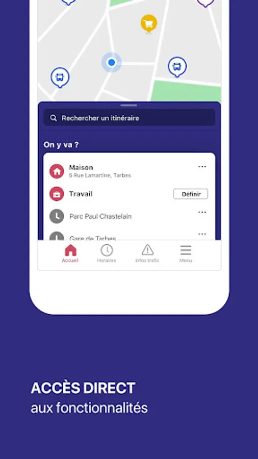- Favorites management: memorize your favorites to find in one movement, from the home page, all the next passages of your bus lines.