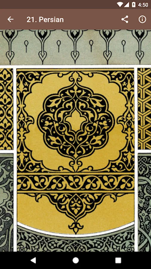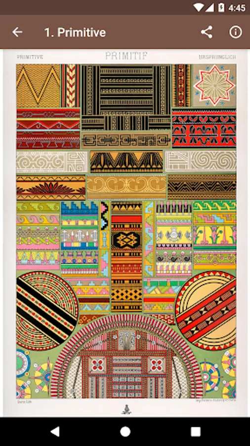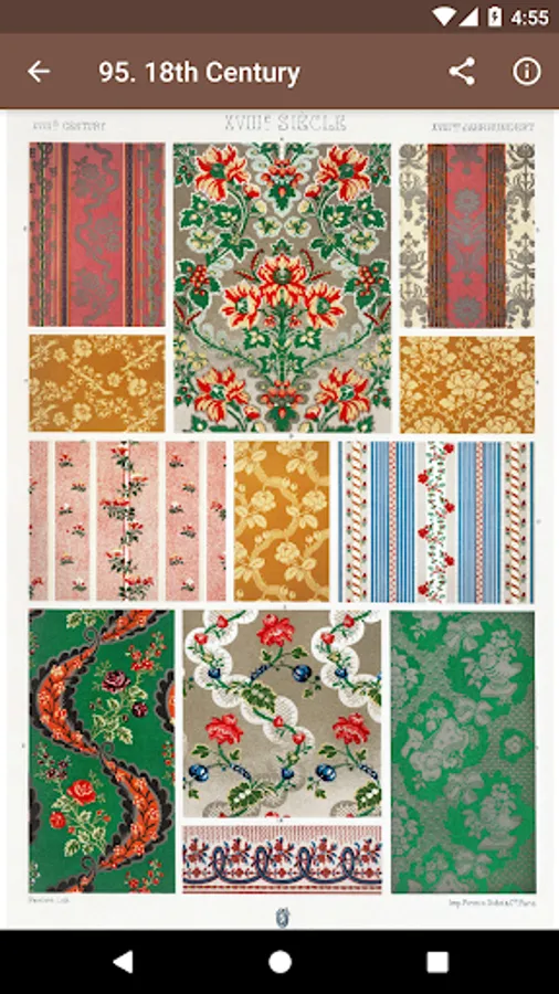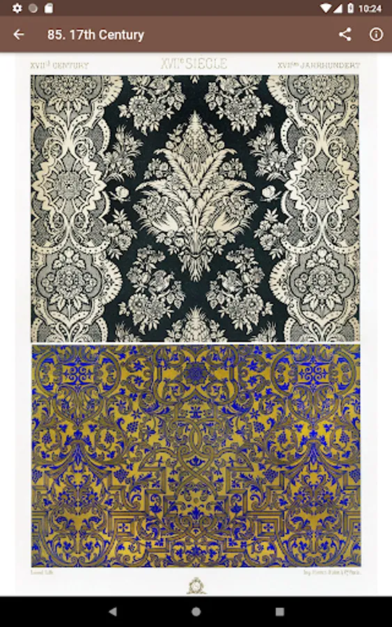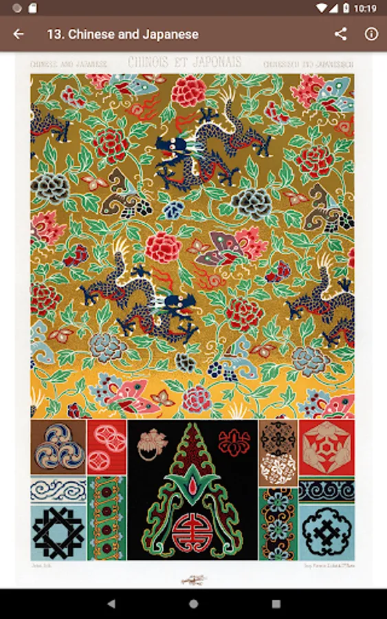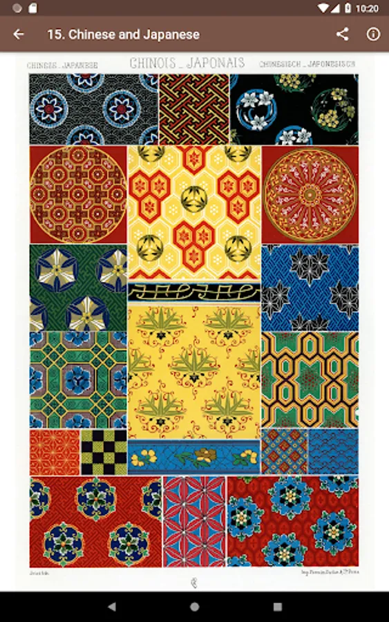 These 100 plates include more than 2000 specimens of design from cultures all over the world, through Antiquity, Middle Ages, Renaissance, 16th, 17th and 18th century, and from various mediums such as painting, textile, metalwork, woodwork, architecture, jewellery, ceramic, mosaic...