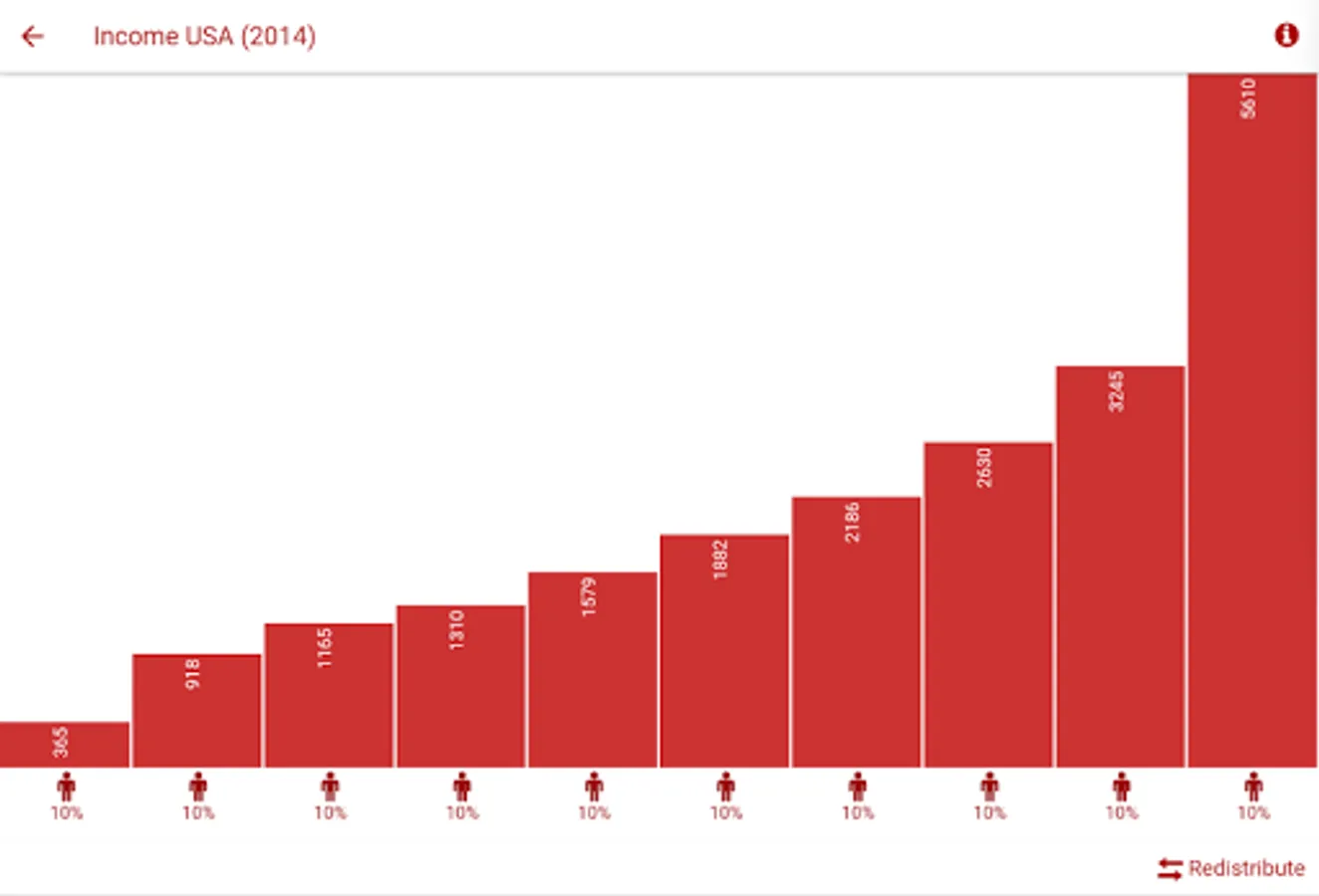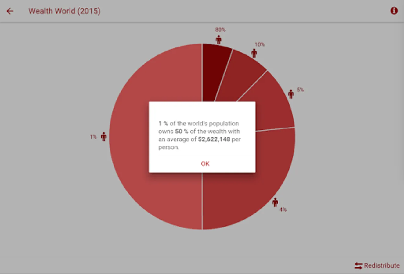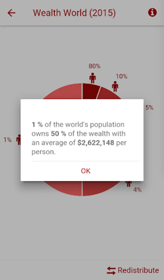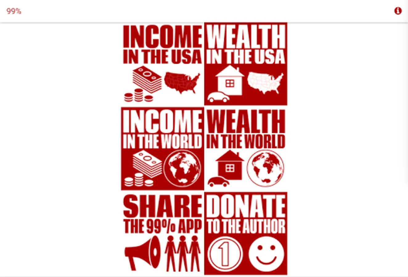 The 99% application presents a summary of the statistics on the distribution of income and wealth in the USA and in the world.