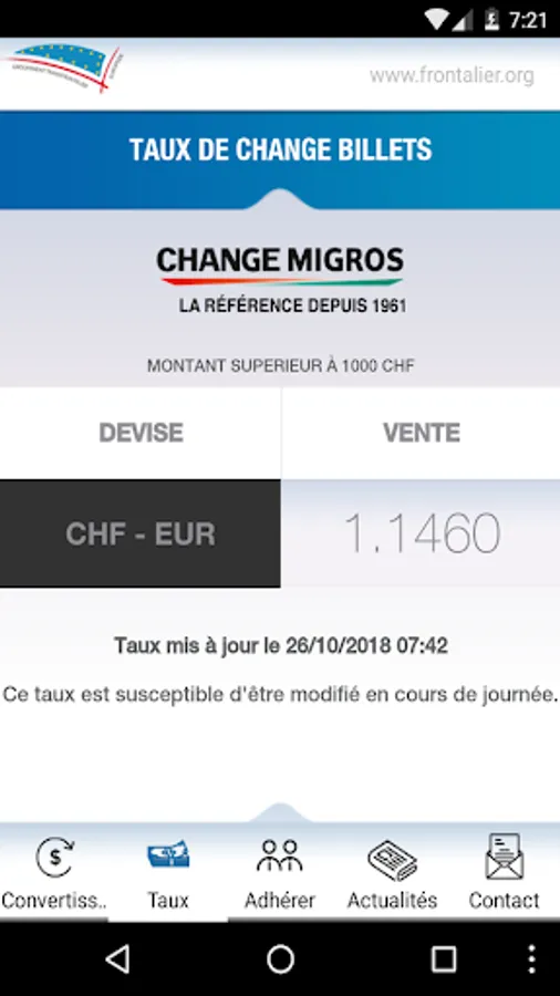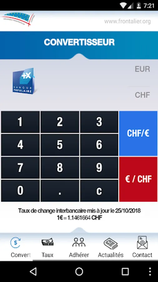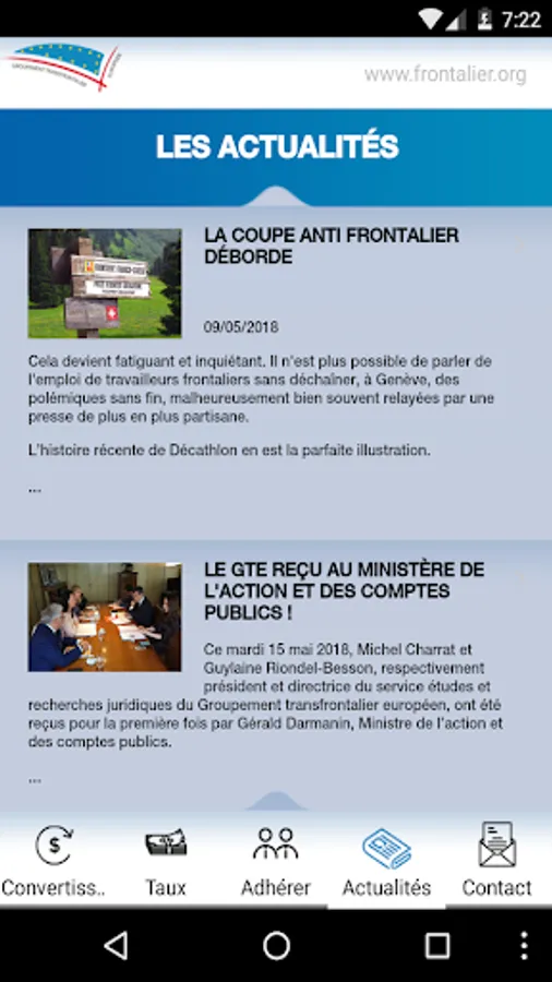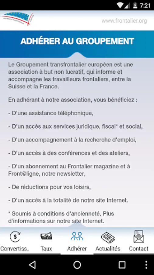 The European Cross-Border Group, an information and defense association for French-Swiss cross-border workers, brings together more than 30,000 members. The Groupement has designed a simple and efficient Euro - Swiss Franc converter. This tool allows you to know the exchange rate of the day and easily convert a sum in the other currency. It also allows you to receive the latest news on the border world.