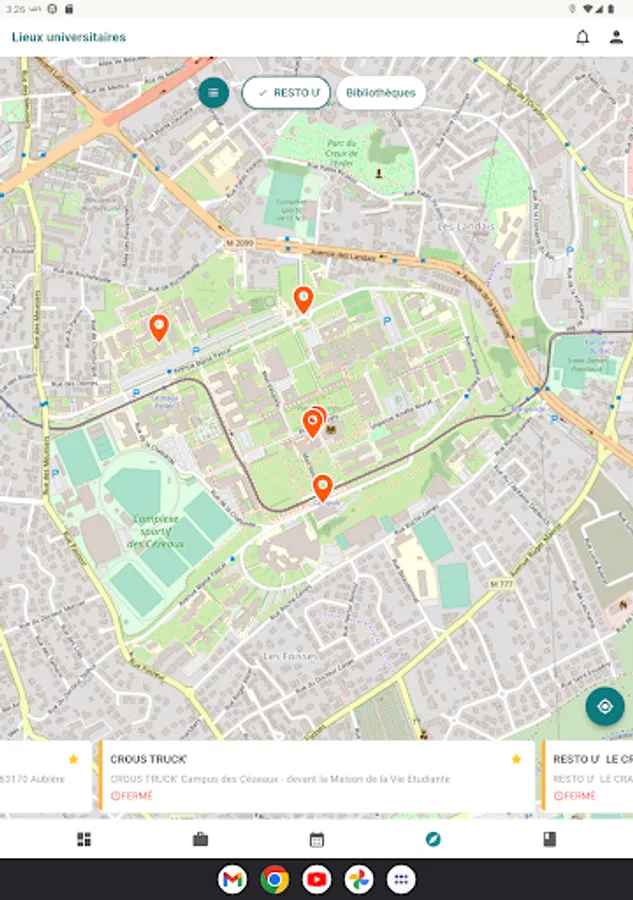 o Locate the address, consult the opening hours and menus of the resto’U.