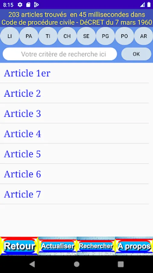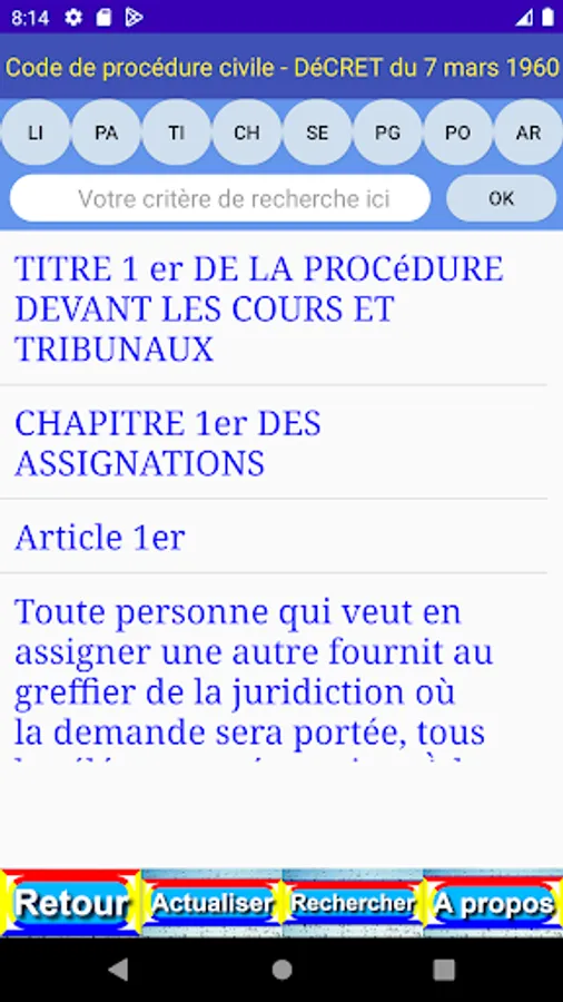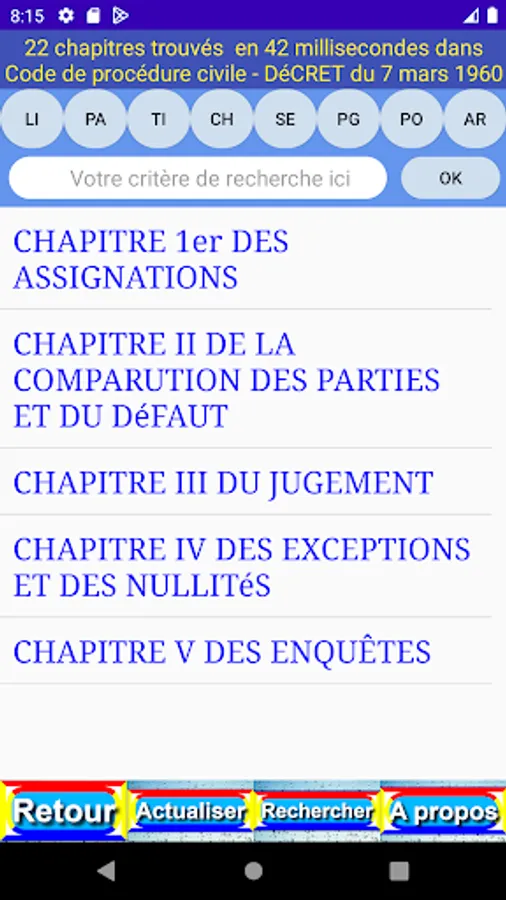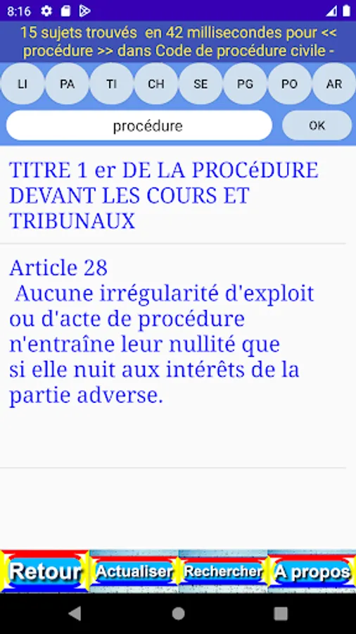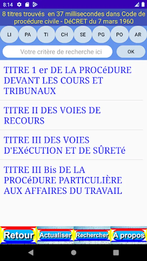 The criterion entered is easily found in the different levels (book (LI), part (PA), title (TI), chapter (CH), section (SE), paragraph (PG), point (PO), article (AR) and content (OK)) of the publication.