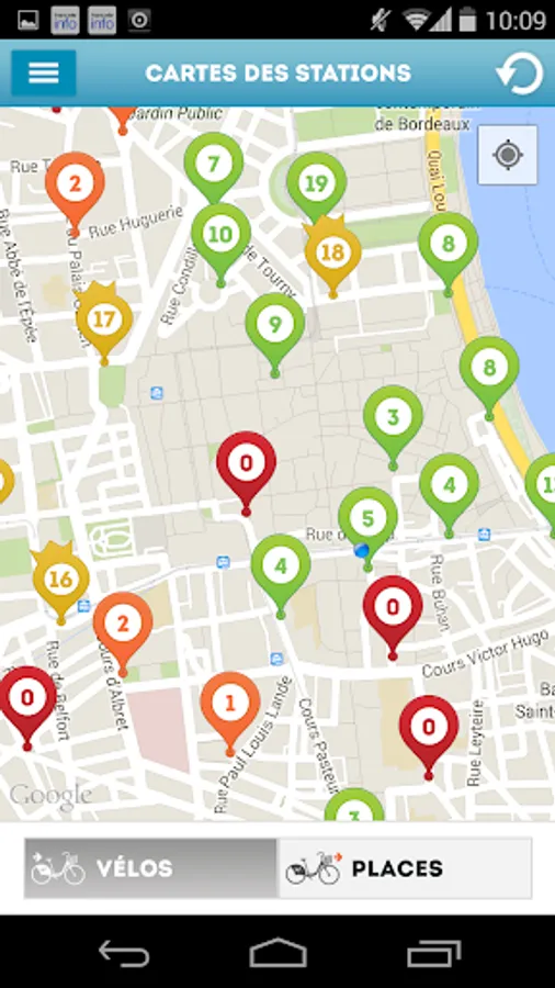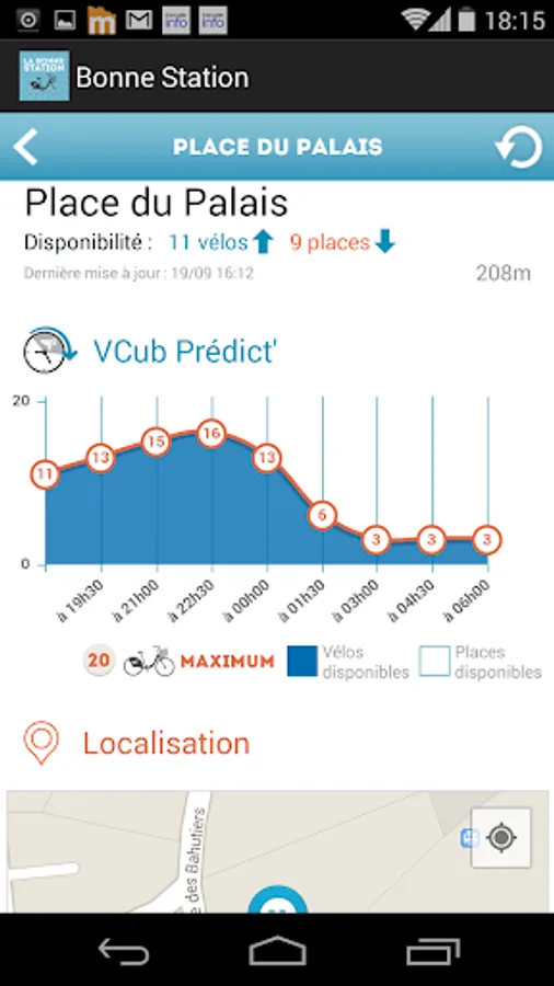 Thanks to the V3 Predict 'feature, developed by Bordeaux start-up company Qucit, the application displays the availability forecasts of V3 stations: