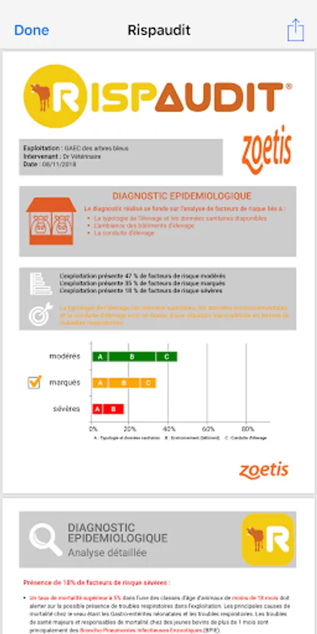 This application contains four completely independent parts: epidemiological diagnosis, clinical diagnosis, analysis of vaccination practices and analysis of fattening practices. Each part contains multiple-choice questions that determine a moderate, high, or severe risk level. Once informed, each part gives rise to the automatic edition of a report in pdf format containing the statistical analysis of the risk factors, their interpretation in terms of gravity, the illustrations of the visit as well as the recommendations written by the speaker.