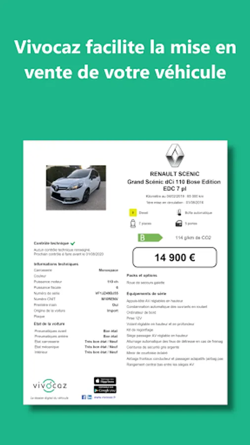 Whether you own or rent a vehicle, new or used, the application VIVOCAZ will allow you to identify it automatically (brand, model, finishes, equipment, etc.) and create a free dematerialized file!