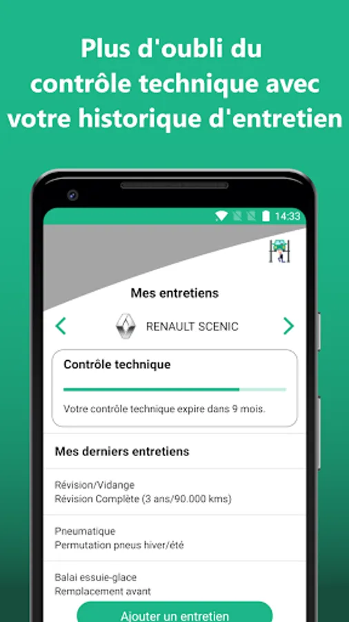 Manage the life of your vehicle. You can record all maintenance and repair interventions, regardless of the professional, to have a regular follow-up and recall of the Technical Control! You will have your intervention history available at any time.