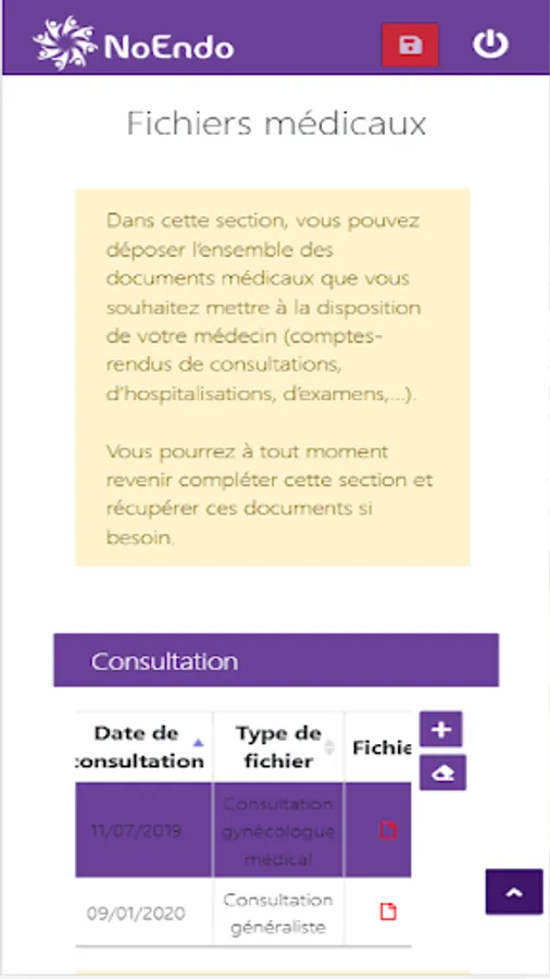 NoEndo is a health center dedicated to the management of endometriosis. This space allows patients to fill in their personal medical data using different questionnaires. Several parts are accessible: history (exams, imaging, surgery), digestive, urinary problems, quality of life, feelings about medical treatment, etc.
