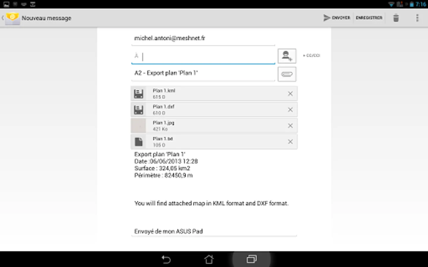 A2 can save plans, edit them and export them via e-mail and Bluetooth with the format "KML" (for use with software like Google Earth, Google Maps, Google Mobile, World Wind, Sketchup ... ) and "DXF" (AutoCAD).