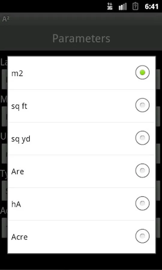 The display area may be: m2 square feet, square yard, Acre, are and hectare.