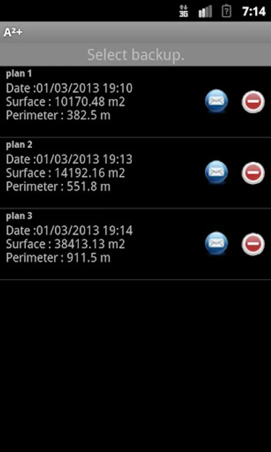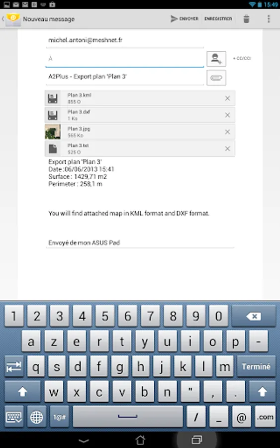 A2+ can save plans, edit them and export them via e-mail and Bluetooth with the format "KML" (for use with software like Google Earth, Google Maps, Google Mobile, World Wind, Sketchup ... ) and "DXF" (AutoCAD).