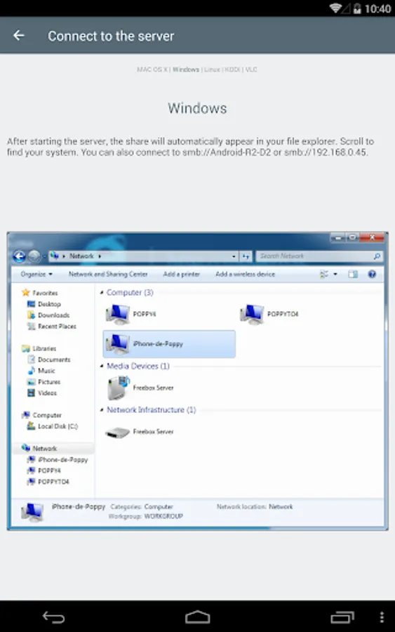 * Access the 'external' storage (Photos and Videos included) in your device as a network shared folder.