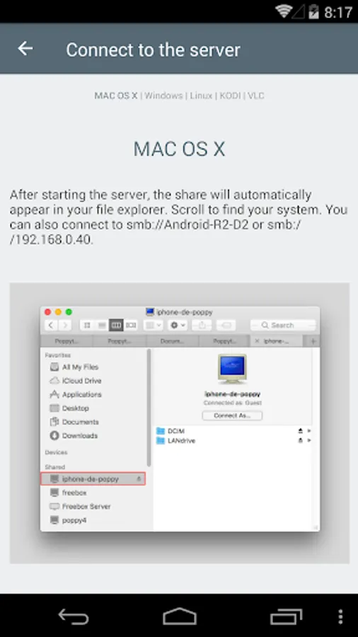 Access your phone/device files with common softwares : MAC OS Finder, Windows File Explorer, Android ES Explorer, VLC, Kodi etc.