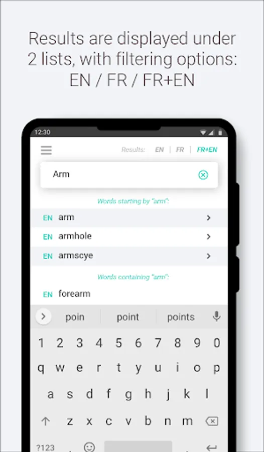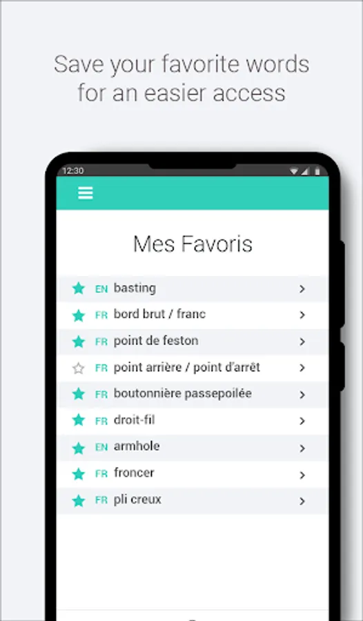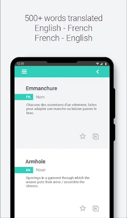 This bilingual dictionary application contains 500+ sewing words translated from English to French and from French to English. A majority of the words already have a definition. We are currently working on adding more translated terms and definitions. In addition, you do have a form in the app to suggest new words to us.