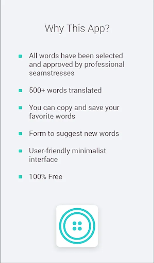 This app already contains 500+ sewing terms translated. However, if you don't find the word you need, you can contact us for word suggestions. There is a form page within the app to do so. Meanwhile, we will work to add new translations and definitions to the app, the sewing community will help us to improve this translator app.