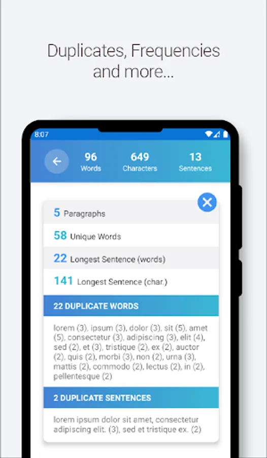 In addition to be app to count words and so, the application find repetitive content (duplicate words and duplicate sentences) within a text.