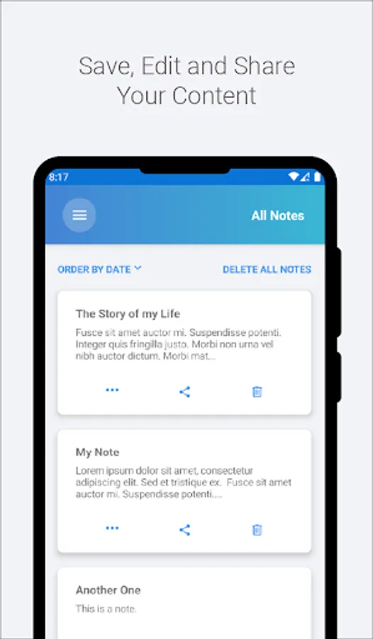 Your content will be saved as notes that you can easily copy and share. This app can be used as a notepad as well (think of it as writing app with word count).