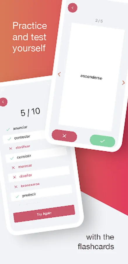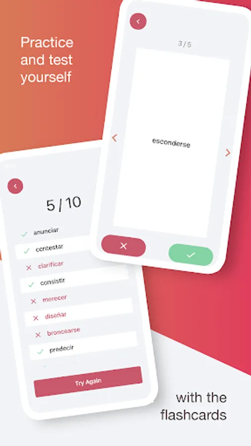 Here's your new app to learn, translate, and search for hundreds of Spanish Verbs and their conjugations. All verb moods and tenses are easy to find and learn. Practice and test your knowledge with the flashcards / memory cards