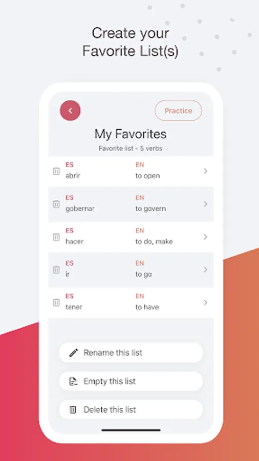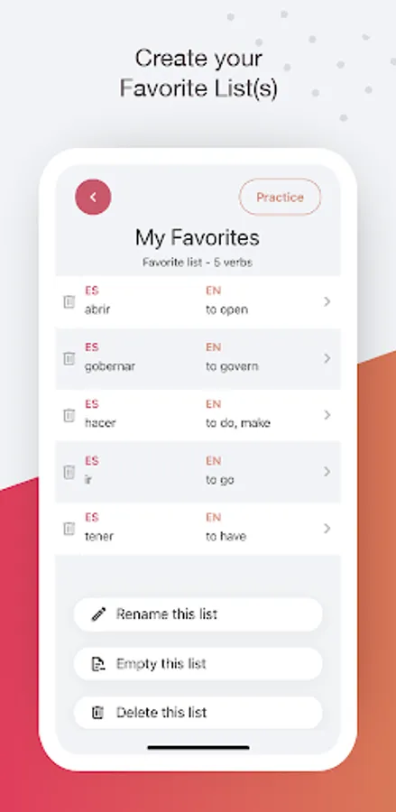 - Create favorite lists to save your favorite verbs, you can then use the flashcard to learn and review these favorite verbs