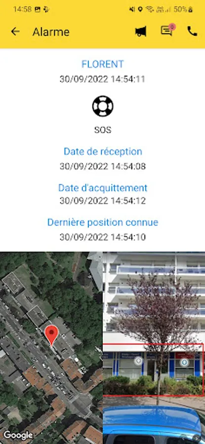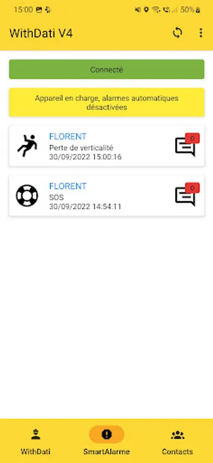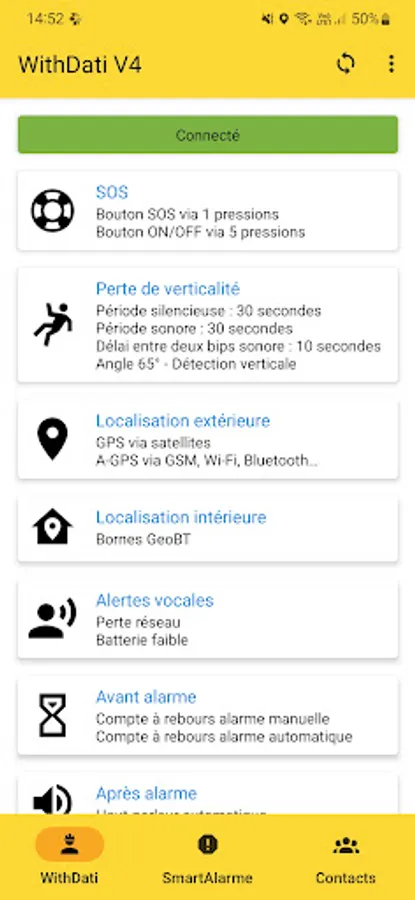 When there is a loss of verticality and/or absence of movement, the smartphone performs a pre-alarm (sound signal or vibration) to warn the user that an alarm cycle is about to be triggered. During this phase, the user can sit up and/or move to cancel the alarm.