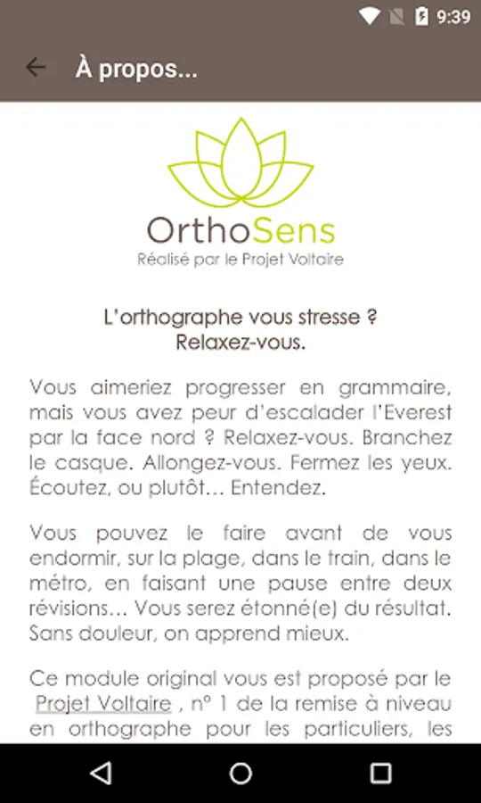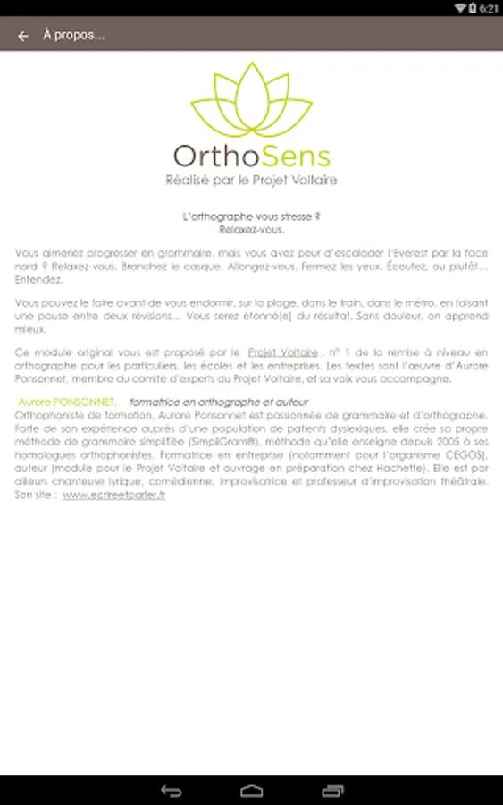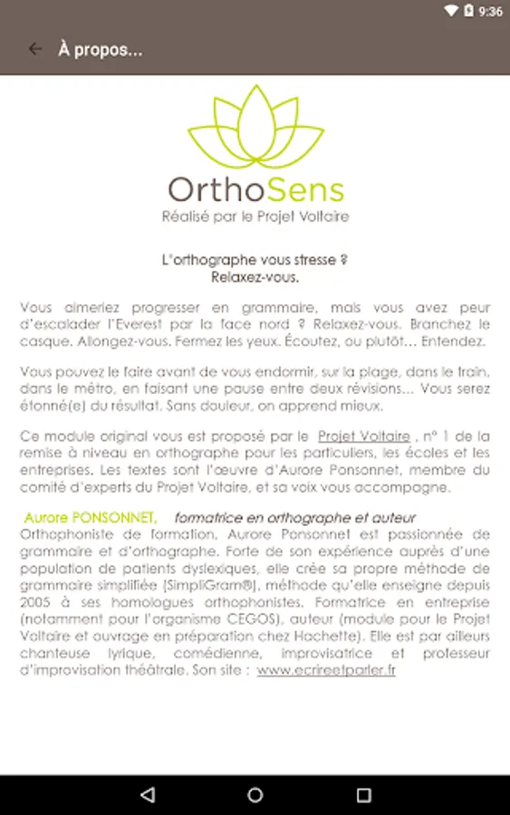 The original module is offered by the Project Voltaire, No. 1 of the spelling refresher for individuals, schools and businesses. The texts are the work of Aurore Ponsonnet, member of the Voltaire Project expert committee, and his voice with you.