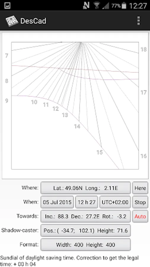 DesCad is a simulator of sundial. It draws in real time all the hour lines of the sundial corresponding to the orientation of the smartphone or the tablet and reproduces the shadow of the style according to the current time and date. At launching, DesCad displays directly the sundial: the setup is automatic. It is then possible to modify the parameters to explore all the configurations. The following parameters are especially modifiable: