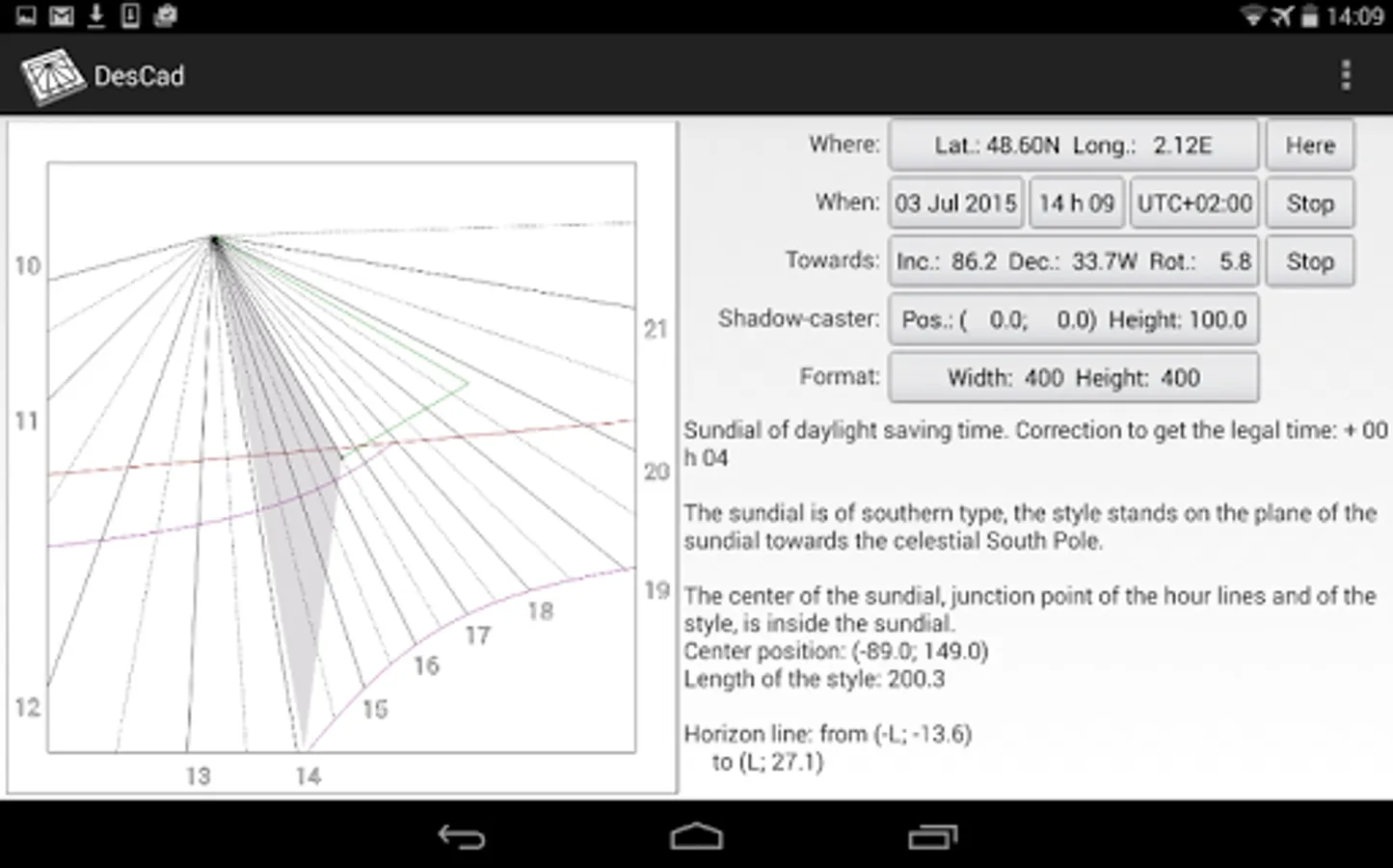 The position / size of the style and the date / time of the shadow can be modified by gestures on the touchscreen. DesCad has therefore a great educational value for those who are interesting in sundial, from beginner to expert in gnomonic.