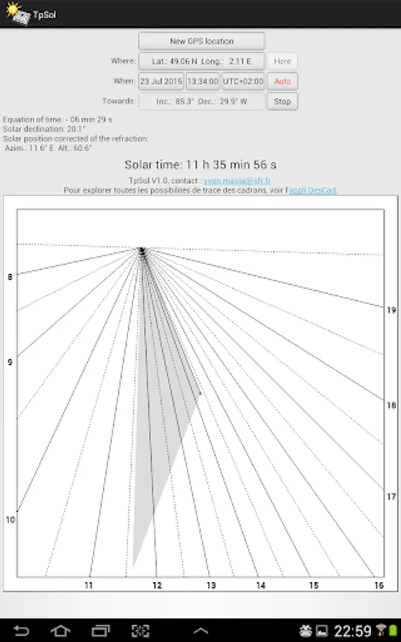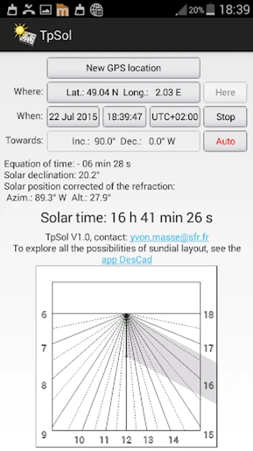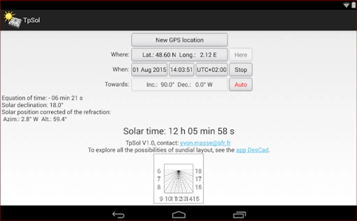 The main function of TpSol is to give the solar time according to the legal time and the GPS location, but TpSol makes much more: