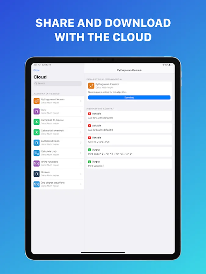 A Cloud subscription is available; It allows you to synchronize your algorithms across your devices and share them with other people on the Cloud.