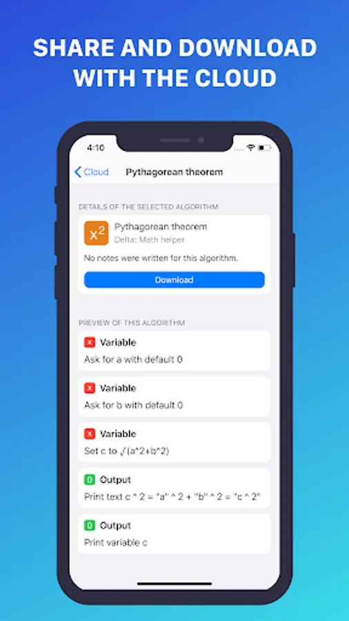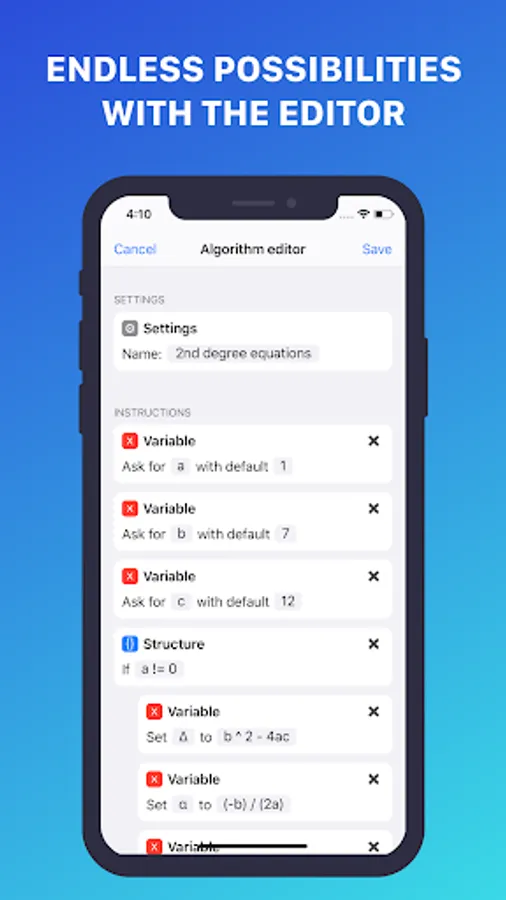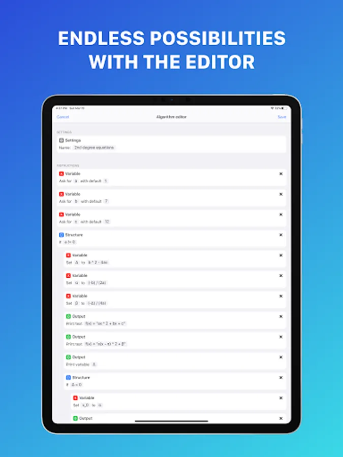 - Save your algorithms on your device, share then on the Cloud, or download ready-to-use algorithms shared by other people