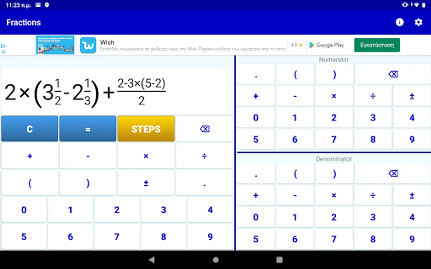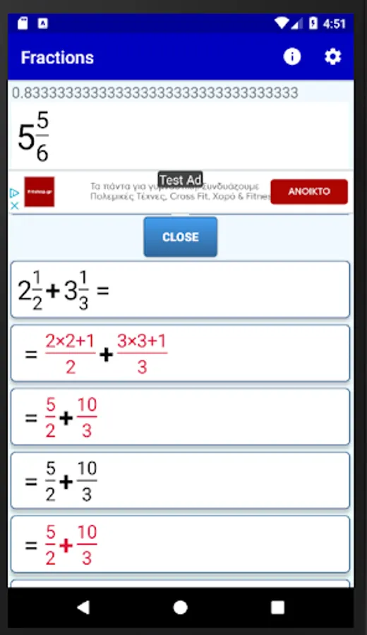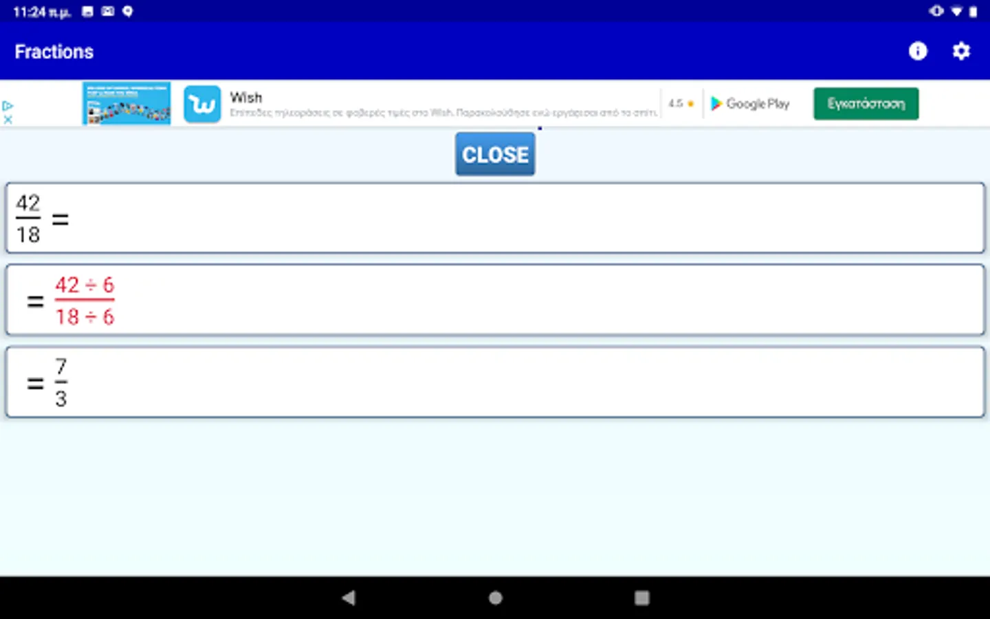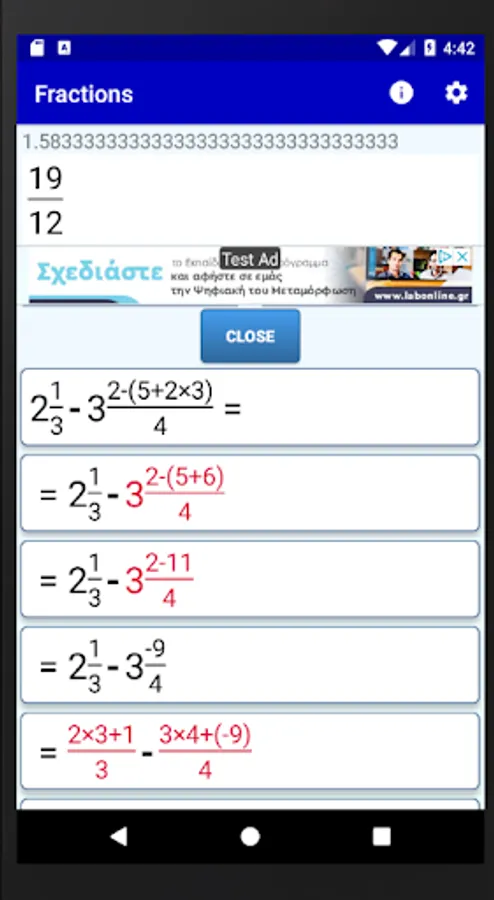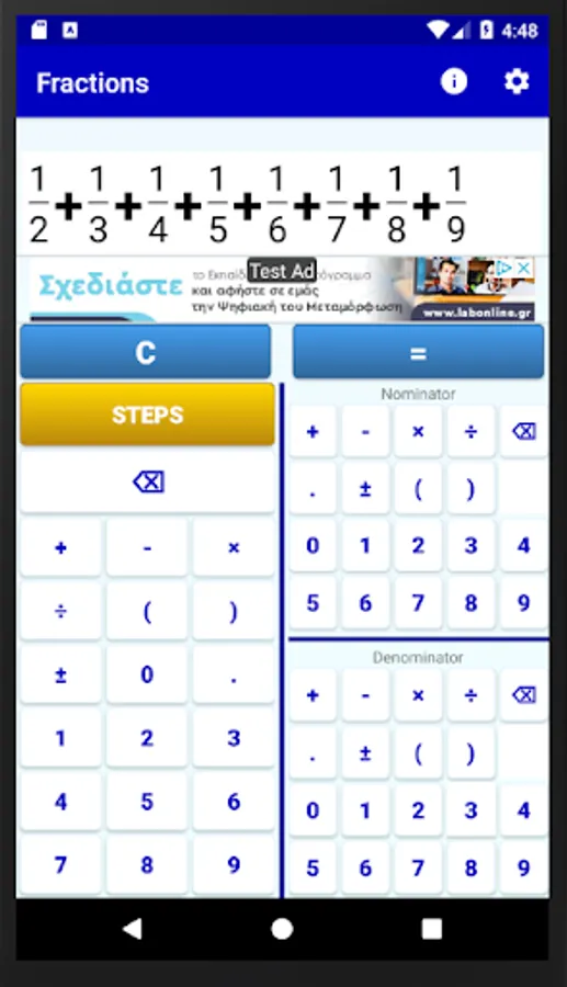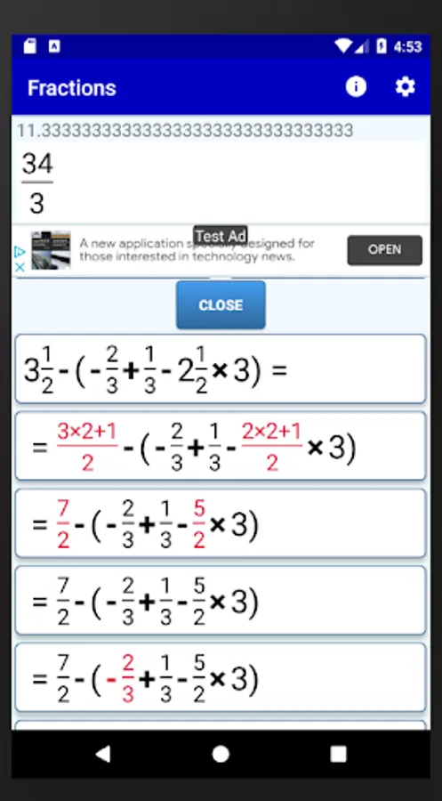 This app is a simple fraction calculator that performs analytic calculations between math fractions. It has an elegant input system and gives analytic step by step solutions.