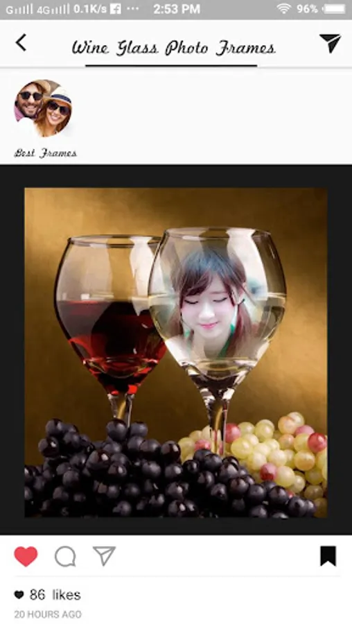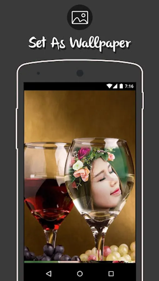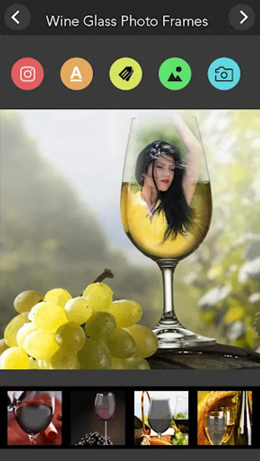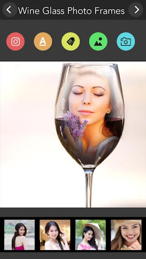 Wine Glass Frame You can take a photo while you see the frame and get a perfect photo, or pick your favorite photo from your phone's gallery to edit and choose a frame that you like.Don't forget to share your new perfect photo to your friends.