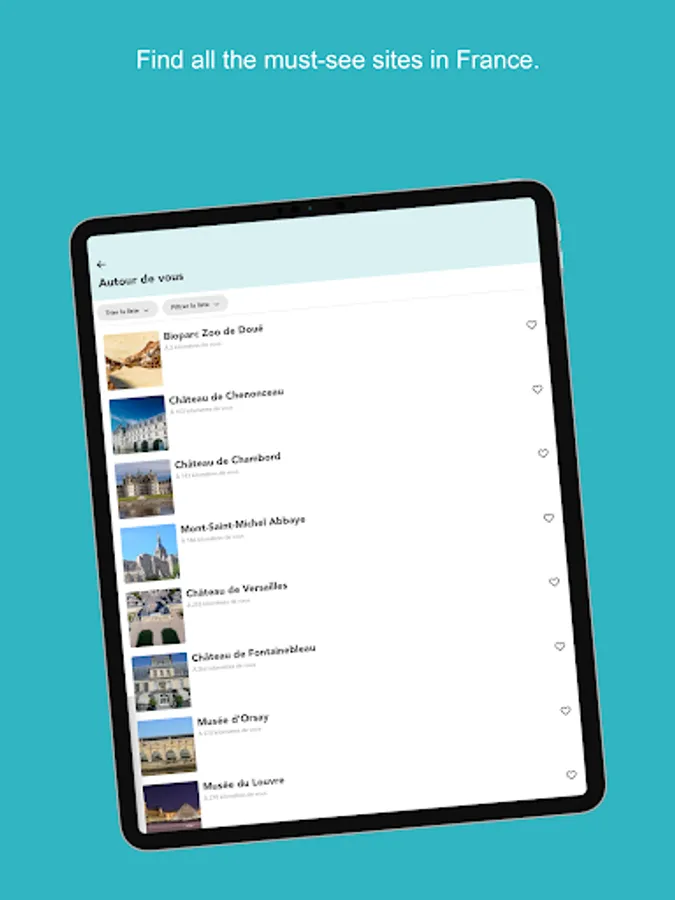 - Discover the 1001 unmissable sites of France: unmissable sites, zoos, aquariums, castles, leisure parks, national monuments, national museums, major sites of France, etc. Visualize these sites intuitively on an interactive map and share with your friends. View Wikipedia and capture all the info. With this application, you will not miss out on a must-see site when you go on vacation.
